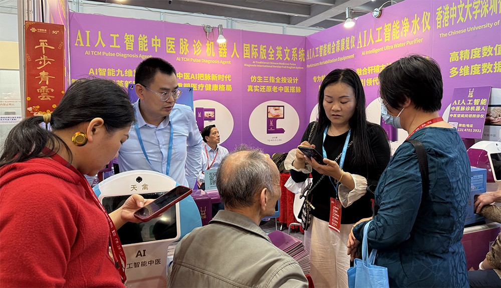 展会现场,天禽医疗科技展区化身"中医科技体验馆":观众把双手放在AI人工智能中医脉诊机器人后,大屏幕实时显示脉象波形与AI分析结果;手机扫码即可获取包含患者面像、舌像、脉搏波、问诊信息的综合健康档案。