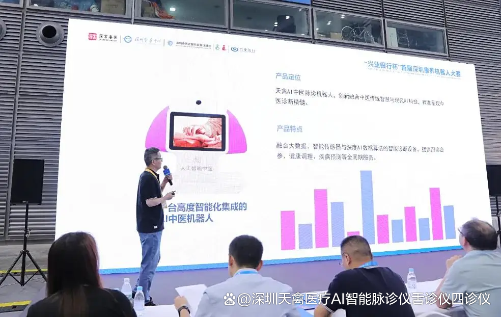 博览会期间的重头戏——“兴业银行杯”首届深圳康养机器人大赛路演环节于9月12日上午隆重举行。天禽医疗科技高级工程师代表公司登上路演舞台,向大赛评委、投资机构及现场观众深入阐述了“天禽AI人工智能中医脉诊机器人”的核心优势与独特价值。