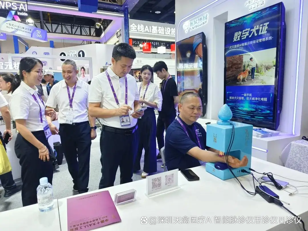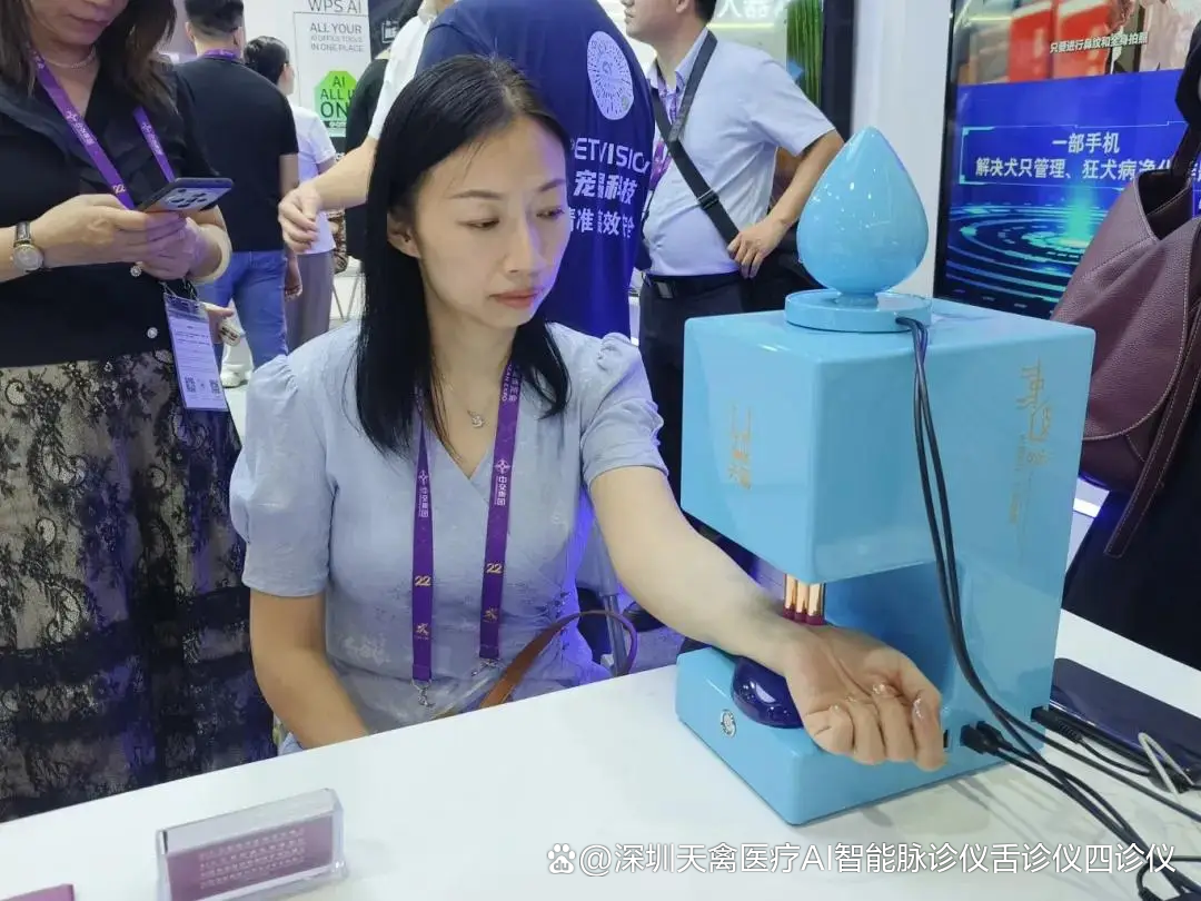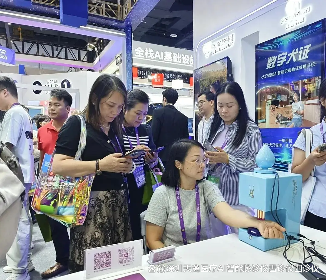 天禽医疗科技凭借全球领先的中医脉诊AI化成果,成为首批入驻该专馆的标杆企业,展台前专业观众络绎不绝,海内外客商纷纷驻足体验这一“AI+中医”的跨界创新。