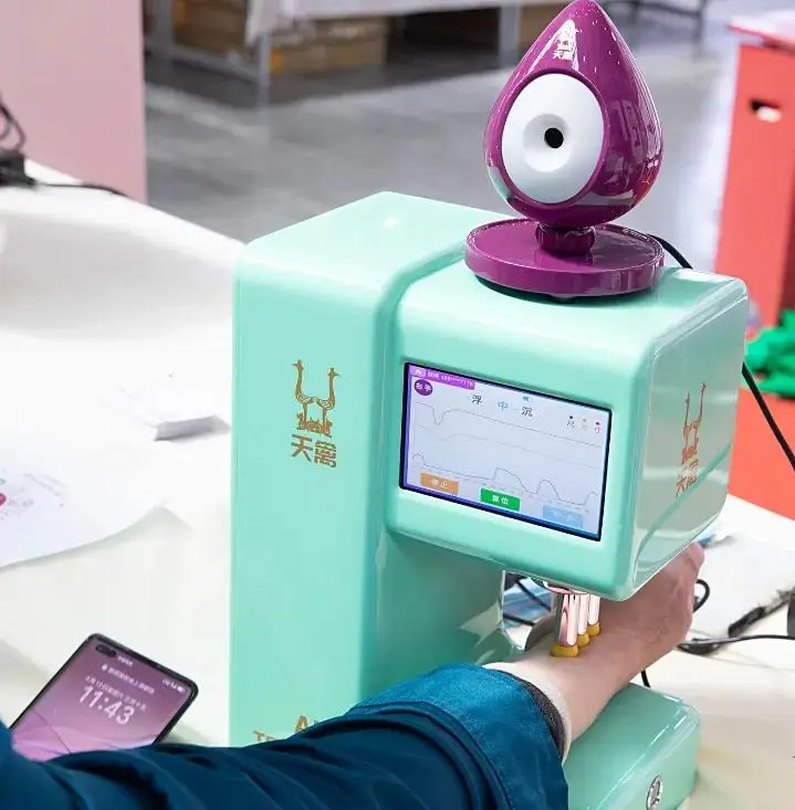 天禽AI中医脉诊仪融合仿生传感、AI算法与超清舌面成像,5分钟完成“脉、舌、面、问”四诊合参。高科技体验感十足,现场就能吸引顾客驻足体验,尤其深受中高端消费群体、注重健康的中年轻人喜爱。
