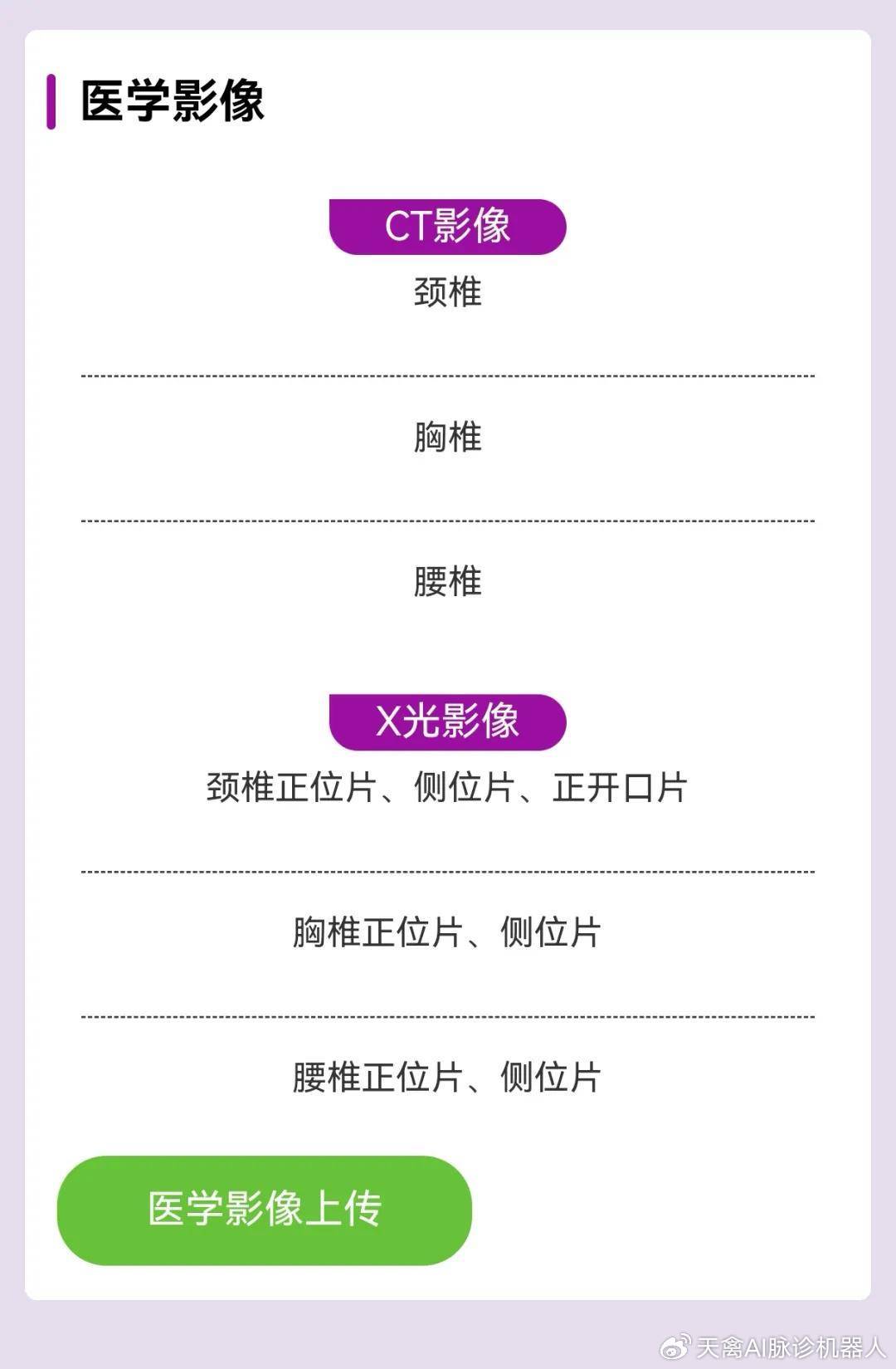 天禽AI中医脉诊仪创新集成多模态影像支持功能,CT、X光等主流医学影像均可一键上传,AI系统自动解析影像内容,精准定位骨骼结构、关节间隙等细节,快速筛查异常病灶(如骨质增生、椎间盘突出等)。报告通俗易懂,真正实现“早筛早诊”。